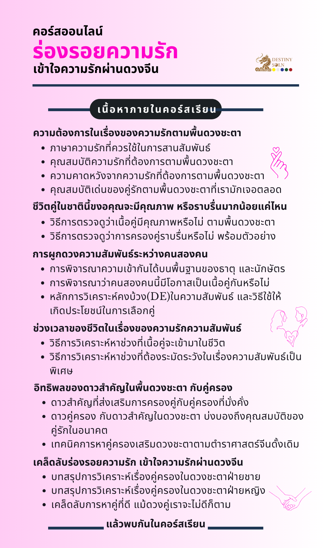 - จำเป็นต้องเรียนคอร์สดวงจีนขั้นพื้นฐาน กับดวงจีนขั้นสูงมาก่อน เพราะเนื้อหาในคอร์สนี้จะเป็นการต่อยอดและมีความเข้มข้นในเนื้อหา