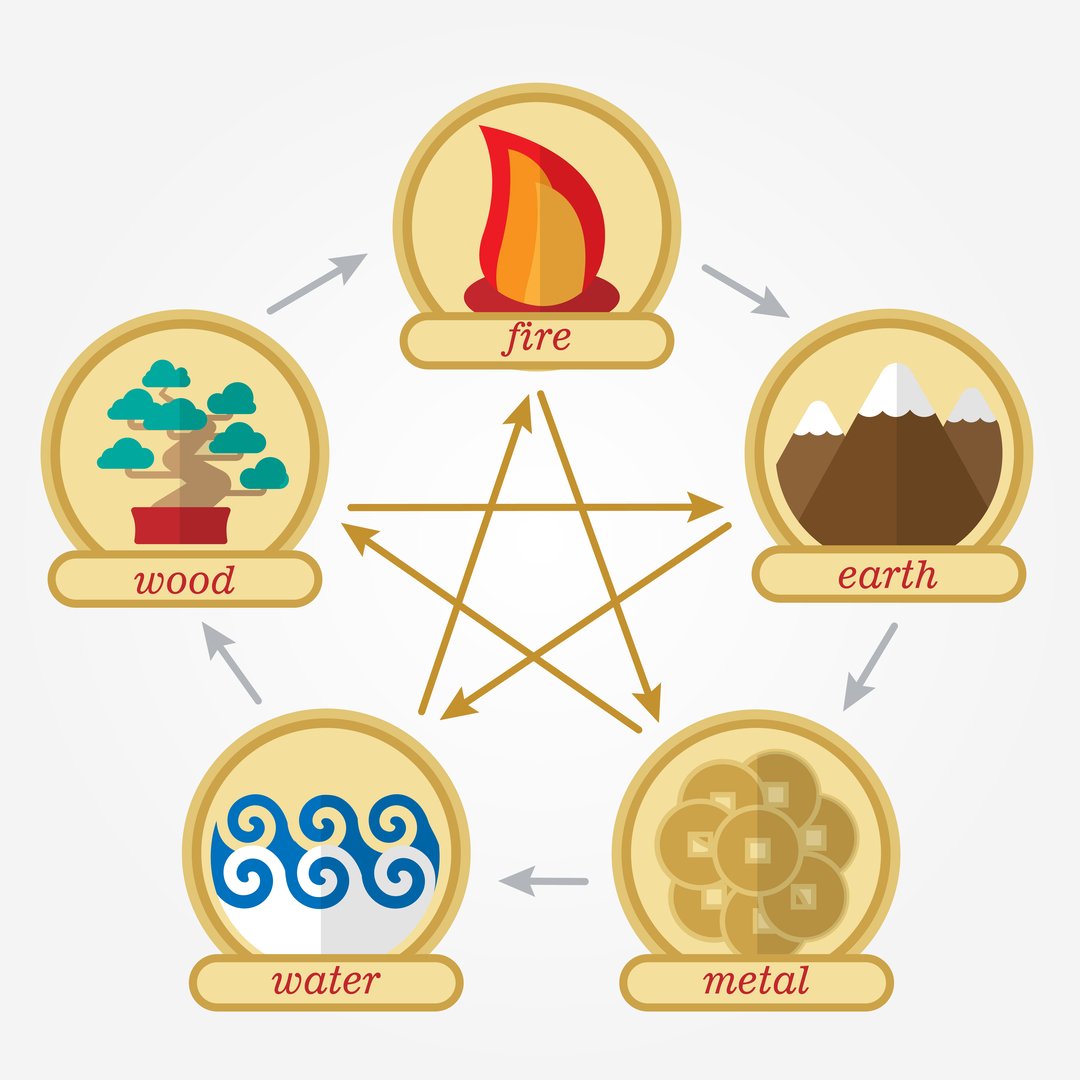 | ตะวันออก | ธาตุไม้ | ทิศตะวันออกเป็นทิศที่มีแสงดวงอาทิตย์ทำให้ต้นไม้ผลิบานและเติบโตจึงให้เป็นธาตุไม้ |